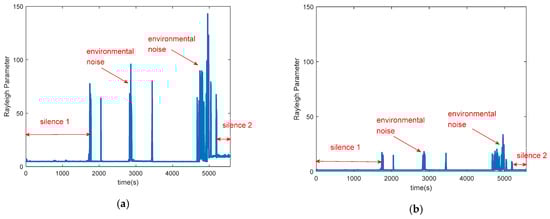 The Rayleigh fitting parameter before and after removing the noise of AGC in the silence environment (a) The Rayleigh fitting parameter before removing the noise of AGC; (b) The Rayleigh fitting parameter after removing the noise of AGC.