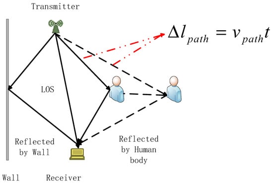 Consider only one signal, its CSI at time t0 is , where A0 is the attenuation, ϕ0 is the phase of dynamic path at t0, and τ0 is the propagation delay. If the path length changes at a speed of νpath, after the short time period t, the path length change Δlpath = νpatht, and the propagation delay change is . The attenuation change can be ignored duration a short time period, the CSI of the signal is: