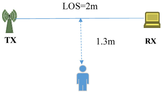 The tangent vector corresponding to the dynamic component is a complex vector, and its amplitude represents the distances between consecutive samples. In order to find the physical meaning of the sample distances, we conducted an experiment, the experimental setup is shown as Figure 8. The WiFi transceivers are placed at a distance of 2m to each other at the same height, and the position of the user is aligned with perpendicular bisector of the transceivers with a distance of 1.3 m.