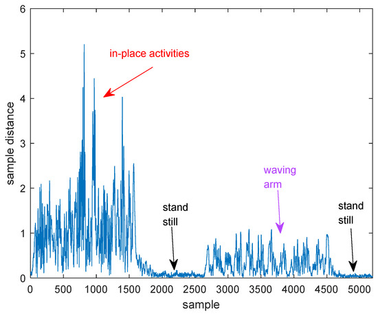 We let a person perform in-place activities at first, and then wave his arm while standing still. Figure 9 shows the distances between consecutive samples when the person doing these two actions. From Figure 9, we can find that the distances between consecutive samples are larger in case of person performing in-place activities than waving his arm. When performing in-place activities, the torso is the main reflection body part. As we all know, the torso of human body has a larger reflection area than other body parts such as arms and legs, so the signal energy reflected from torso is stronger than that reflected from arms and legs [44,45], so the amplitude of the tangent vector can represent the signal energies reflected from different body parts.