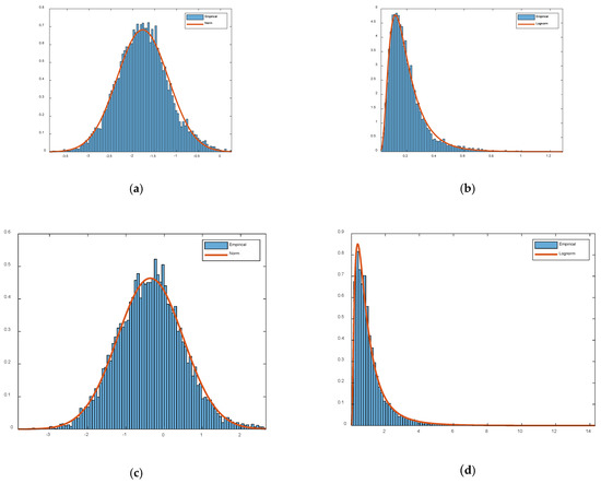 Probability Density Function (PDF) of log(α(t0 + Δtk)), α(t0 + Δtk) in both a silent environment and a dynamic environment. (a) PDF of log α(t0 + Δtk) in a silent environment; (b) PDF of α(t0 + Δtk) in a silent environment; (c) PDF of log α(t0 + Δtk) in a dynamic environment; (d) PDF of α(t0 + Δtk) in a dynamic environment.