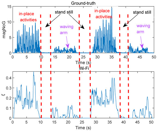 Wi-Fi is particularly promising as Wi-Fi access points and devices are already ubiquitous and thus there is no need of deploying any extra infrastructure. The latest research explores the possibility of employing Wi-Fi channel state information (CSI) for indoor localization [16,17,18,19,20,21,22], gesture/activity recognition [23,24], gait recognition [25] and motion detection [26,27,28,29,30,31]. Current Wi-Fi based activity recognition systems usually aim to identify specific activities and require manually segmenting the activities in advance. Current Wi-Fi-based localization systems require labor-intensive training, phase calibration, and the 90th percentile error of these methods can be up to 2 m [19], thus these systems can cause lots of false results when performing area detection. Moreover, we find that, in a lot of scenarios in smart home environment, for elder daily life monitoring, obtaining continuous health-related information (i.e., elder’s staying area, motion state and activity intensity levels) during a specific time period is essential. Thus, the area where the elderly stays in, the motion state (still or non-still [28]) and the activity intensity level of the elderly are three important health-related information for a continuous long-term elderly monitoring system.