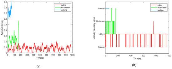 Figure 16 only shows the instantaneous vitality, in order to mine more information on human vitality, such as the characteristics of daily activities, we need to analyze vitality information from a perspective of a time period. For example, we can average the instantaneous intensity within a short time period (10 s) every 0.05 s, and category the averaged intensity into different intensity levels (such as silence, slight, moderate, and intense) according to the averaged intensity values. Take three types of daily activities (walk, brush teeth, eating) as example. the averaged activity intensity and the corresponding activity level of the three types of daily activities are shown in Figure 17. Figure 17a shows the averaged activity intensity of the three types of daily activities, and Figure 17b shows the corresponding activity level. From Figure 17, we can find that among the three activities, the activity level of walking is higher than the other two activities.