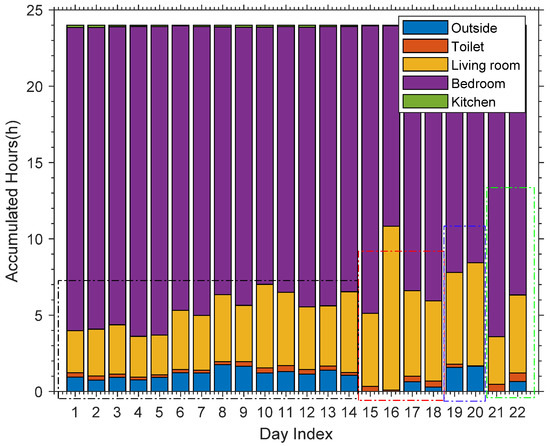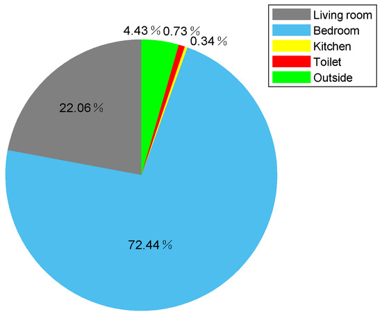 It is well known that in the smart home environment, physical activities are area-related, such as sleeping usually takes place in the bedroom, and cooking usually takes place in the kitchen. Analyzing the area occupation rate during 24 h of the elder, could help us to find out the living habits of the elder. Figure 18 shows the area occupation rate of volunteer 1 during 24 h. From Figure 18, we can find that the volunteer 1 spends most of the time in bedroom in one day, and spends the least time in kitchen since the volunteer 1 only enters kitchen to wash dishes after lunch and supper.