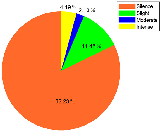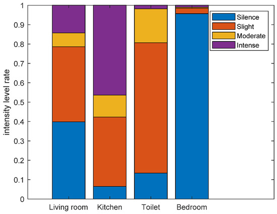 Since activity intensity is more fine-grained sensing than motion, in this subsection, we only analyze activity intensity instead. As described in Section 5.2, we average the instantaneous intensity within a short time period (10 s), and categorized activity intensity into four levels (silence, slight, moderate, and intense) according to accumulated instantaneous intensity. Similar to long-term area staying information, we can also analyze the living habits of the volunteers in the perspective of long-term activity level information. Figure 20 shows the overall intensity level rate during 24 h of volunteer 1. From Figure 20, we can find that among the four activity levels during 24 h of volunteer 1, the rates of silence (82.23%) and slight (11.45%) level are much higher than moderate (2.13%) and intense (4.19%). Through the corresponding ground truth video, we can see that besides sleeping, the volunteer 1 spent most of the time on sedentary behaviors, such as working at a computer in the bedroom, reading book in the bedroom, and watching TV in the living room, etc. while spending less time on walking, cleaning, and exercising, etc. Considering physical activities are area-related, different types of activities usually take place in different areas, so the activity levels of different areas are also different. Figure 21 shows the activity level rate of different areas during 24 h of volunteer 1. From Figure 21, we can find that the rates of silence and slight level are higher than 90% in bedroom, due to sleeping and working at a computer are performed in the bedroom. The rate of intense level in the kitchen is the highest among the four areas, due to cleaning and wash dishes are performed in the kitchen.