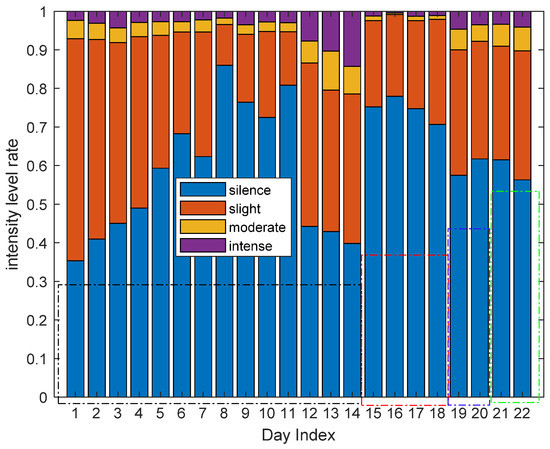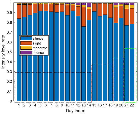 In order to obtain the living habits of one user and the diversity habits of different users in the perspective of long-term activity level information, we can also analyze the activity level rate of all the 22 days of four volunteers in a specific area and in all the four areas overall. Figure 22 shows the intensity level rate of all the volunteers in the living room. Similar to Figure 19, the first 14 days are the results of volunteer 1, the fifteenth to eighteenth days are the results of volunteer 2, the nineteenth to twentieth are the results of volunteer 3 and the last two days are the results of volunteer 4. From Figure 22, we can also spot regularities in living habits of one volunteer, and the diversity of different living habits between different volunteers and the same volunteer of different days.