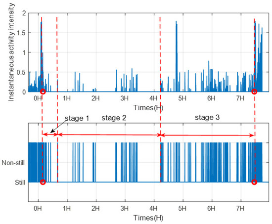 Through analysis statistical properties of human vitality information, we not only can capture the living habits of users, but also detect abnormality. Take sleep as an example, since sleep plays an important role in our health and well-being. Low quality of sleep will increase the risk of sleep disorders. In this paper, we can use instantaneous activity intensity to analysis body movements during sleep. We consider motion states as those instantaneous activity intensity values which are larger than zero. Figure 24 shows the instantaneous activity intensity and the corresponding motion status during sleep of volunteer 1. From Figure 24, we can find that the body movement during sleep can be roughly divided into three stages: stage 1, stage 2 and stage 3. The body movement is frequent in stage 1, as the volunteer 1 is going to sleep. The body movement is less frequent in stage 2 and is the most frequent in stage 3.