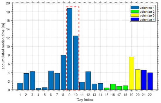 The accumulated motion time during sleep of all the volunteers.
