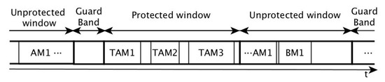 The IEEE Std 802.1Qbv standard is commonly known as the Time-Aware Shaper (TAS). TAS divides the communication time into slots, called cycles. Each cycle is in turn divided into windows, each window dedicated to a different type of traffic. For instance, the standard shows an example where the communication cycle is divided between a protected and an unprotected window, separated by a guard band to prevent unprotected traffic from interfering with protected one, as shown in Figure 1. In the example, the protected window is devoted to the transmission of traffic with real-time requirements, while the unprotected window is devoted to the transmission of best-effort traffic.