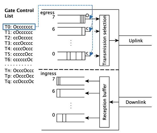Regarding the operation of TAS, each transmission gate can be in one of two states:(i) open: queued frames can be elected for transmission by the transmission selection algorithm, or (ii) closed: queued frames cannot be elected for transmission. Figure 2 shows the internal structure of a port that implements the TAS. At time instant T0, the gate of the egress queue of priority 7 is open, whereas the other gates are closed.