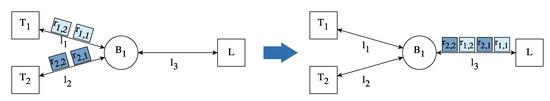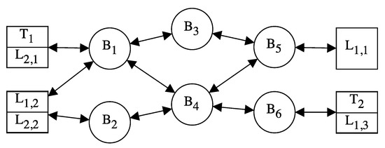 Figure 6 depicts the operation of a network that uses approach B to tolerate faults in the links. The network topology and the faults are the same as in Figure 5, but we see that the network behaves differently. Specifically, we can see that, even though is lost in link , transmits three new replicas through link . This is because bridges only keep the first correct replica they receive and discard the surplus ones, and, then, they create a new set of replicas during transmission. Again, replica is affected by a fault in link , but L receives two replicas now, instead of one. Thus, L receives replica first, and delivers it to the application and discards replica .