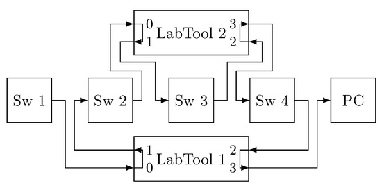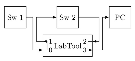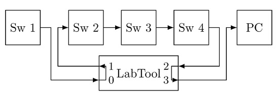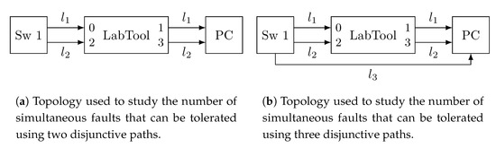 Figure 4 shows the topologies used for these experiments. Specifically, we use a Multiport TSN (MTSN) switch (indicated in Figure 3 as Sw 1) that acts as an end-system that generates traffic and transmits it through several interfaces. The fault injection device (indicated in Figure 3 as Labtool) is used to inject faults in the links as needed in each experiment. Finally, the PC executes the network analyser tool Wireshark to capture the traffic received through the different links. Figure 4a shows the topology used for experiments I, II and III with two redundant paths; whereas Figure 4b shows the topology used for experiment IV, with three redundant paths. Regarding the traffic configuration, frames transmitted are configured to have priority 5 and frame size of 787 bytes, i.e., 754 bytes of payload plus control information. Furthermore, we transmit 1000 frames through each link in each experiment.