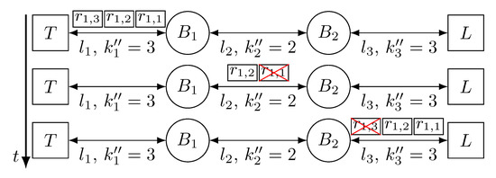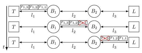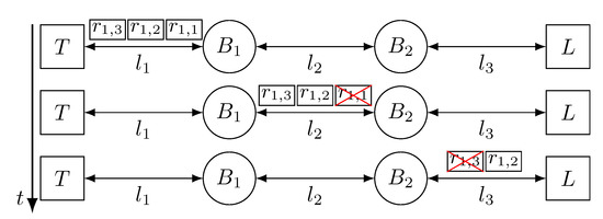 Figure 7 depicts the behaviour of a network that uses approach C to tolerate temporary faults in the links. The scenario shown in Figure 7 is the same as in Figure 5 and Figure 6, but we can see that the number of replicas transmitted by the devices varies. T transmits 3 replicas through link , but we see that, even though all replicas are correctly received by , it only transmits two replicas through link , as it is configured to do so. Again, replica is affected by a fault in link and, thus, dropped by . Nevertheless, transmits 3 replicas again and, even though replica is affected by a fault, L receives replicas and , it delivers to the application and discards .