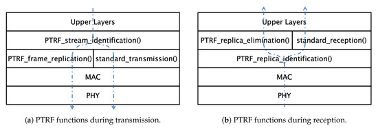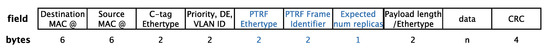 Regarding the types of traffic, we must note that TSN supports TT and event-triggered traffic with real-time guarantees, as well as best-effort traffic. PTRF is designed to provide time redundancy for critical frames, which are usually related to TT communications. Nevertheless, event-triggered traffic may also convey critical traffic, such as alarms. Thus, the PTRF mechanism can be used to replicate any type of traffic, even best-effort one. It is the responsibility of the network manager or management entity to decide which traffic should be replicated or not and to ensure the timing guarantees of the traffic.
