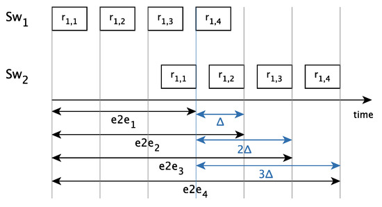 Figure 14 depicts the jitter introduced by PTRF when transmitting a different number of replicas in the presence of faults. Let us assume that Sw1 only transmits two replicas, and . Let us also assume that in one transmission reaches Sw2 with end-to-end delay . Let us now assume that in another transmission, does not reach Sw2, but does. In this case, the end-to-end delay is . The difference between both end-to-end delays is the jitter, indicated with in Figure 14. We also see in Figure 14 the jitter when transmitting three replicas, , and four replicas, .