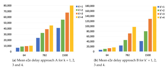 Mean value for the maximum end-to-end delay for approaches A and B with k = k’ = 1, 2, 3 and 4. The X axis represent the frame length in bytes, while the Y axis represent the end-to-end delay in nanoseconds.