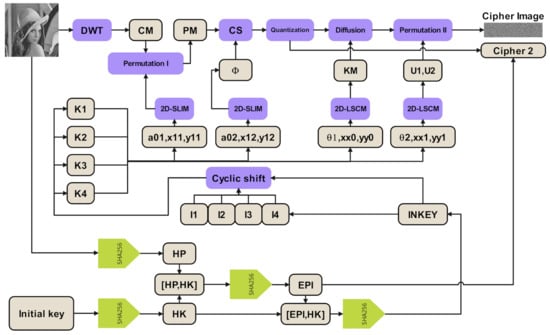 In this subsection, we will introduce our proposed encryption scheme. The encryption scheme takes, as inputs, plain image P, initial key K, and compression ratio CR, and put outputs, such as cipher image and some additional ciphertext information. The compression ratio (CR) means the ratio of the number of pixels in the compressed image to that in the original image. Figure 1 shows the block diagram of the encryption scheme, and the detailed description are as follows: