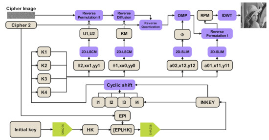 The decryption process is the inverse process of encryption, and it takes input as cipher image C1, additional cipher information C2, and initial key K, and put the output as recovering plain image. Figure 2 shows the block diagram of the decryption scheme, and the detailed description is as follows: