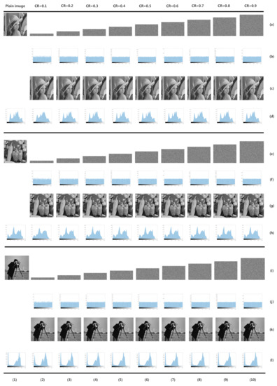 Encryption simulation. Rows (a–d) are the simulation results of image ’Lena’, Rows (e–h) are the simulation results of image ’Pepper’ and Rows (i–l) are the simulation results of image ’Cameraman’. Column (1) are plain images. Columns (2–10) are the simulation results of CR = 0.1, ⋯, CR = 0.9, respectively.