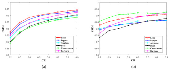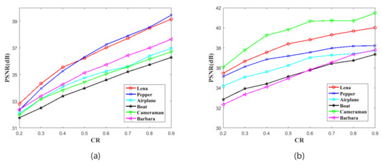 In order to evaluate the efficiency of our proposed image cryptosystem, we give the time complexity analysis and the time consuming of the simulation in this subsection. In this paper, we use two 2D-SLIM and two 2D-LSCM hyper chaotic systems to control the processes of compressive sensing and encryption, and it needs a total of iterations of computing floating point number. As we all know, there are many factors that affect the results of the actual test, such as hardware and software environments, programming languages, code optimization, parallel processing, programming skills, etc. Therefore, we give our simulation results of the time consumption under the environments that are mentioned at beginning of Section 4 and while using parallel computing technology. In our test, we encrypt and decrypt the same image 100 times, taking the average time. The encryption time of Lena is s and the decryption with CR , , are s, s and s, respectively. The encryption time of Pepper is s and the decryptions with CR , , and are s, s, and s, respectively.