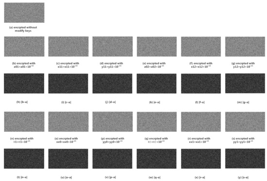 The robustness of the image cryptosystem means that some useful information can still be recovered when the cipher image is disturbed by noise or part of the data is lost during transmission. The robustness of the image cryptosystem in real communication applications is very important. In the test, some noise and different data loss amounts are added to Lena cipher images that are encrypted on CR to evaluate the robustness of our proposed image cryptosystem. Figure 11 shows the test results. Most of the information in the plain image can still be identified from the decrypted image, as shown in Figure 11. Figure 11a–f are cipher images with , , , , , salt & pepper noise, respectively. Figure 11g–l are corresponding decrypted images. Figure 11m–o are the cipher images with data lost. Figure 11s–u are corresponding decrypted images. Figure 11p–r are the cipher images with data lost. Figure 11v–x are corresponding decrypted images. It is shown that the algorithm has good robustness and it can be applied to practical scenarios.