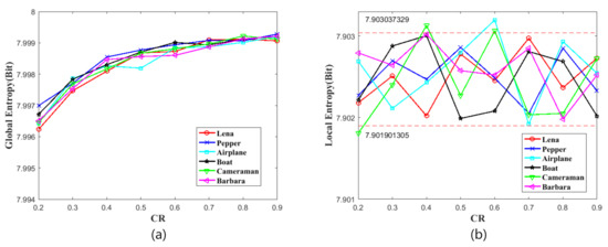 where is the GSE of image block . For this test, the parameters are selected. In this situation, the ideal value of LSE is 7.902469317. When the significance , the tests passed when the test results fell into the interval . Table 8 shows the LSE test results. Figure 10 shows the global and local entropy analysis. According to this figure, the global entropies are increasing with CRs and the local entropies are floating with CRs. Nevertheless, the minimum of global entropy of 7.9962 entails sufficient security and the local entropies basically fall in security interval. Therefore, the information entropy results show that the cipher images that are generated by our proposed image cryptosystem have excellent randomness.