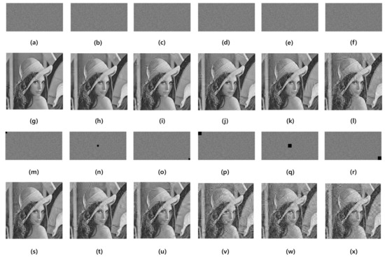 The robustness analysis result. (a–f) are cipher images with , , , , , salt & pepper noise, respectively. (g–l) are corresponding decrypted images. (m–o) are the cipher images with data lost. (s–u) are corresponding decrypted images. (p–r) are the cipher images with data lost. (v–x) are corresponding decrypted images.