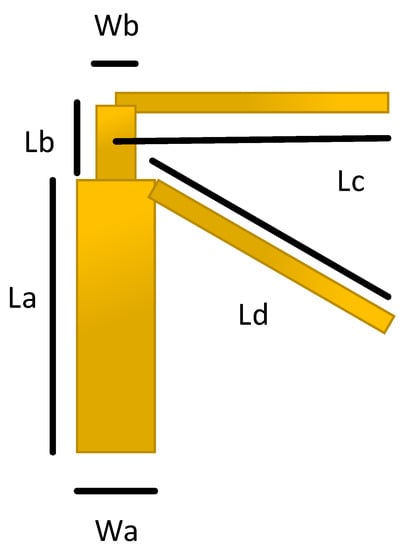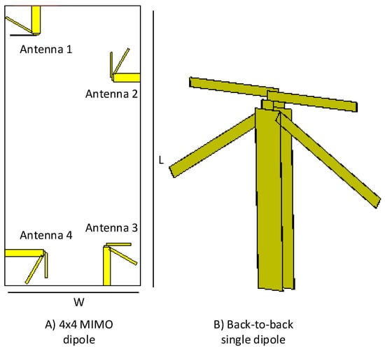 In this section, we illustrate the structure of our proposed antenna design by using multiple views. The substrate’s dimensions, placement of each of the antenna element present in the structure, and the 3D/back-to-back view of a single antenna element of the proposed dipole design are shown in Figure 1. Figure 1A shows the dimensions of the substrate used, which is equivalent to the size of any standard smartphone available in the market. Length L of the substrate is set as mm, and the width W of the substrate is chosen to be mm. Rogers 5880 has been used as a substrate material to support the radiating antenna elements. The dielectric constant, of the substrate material is having a dissipation factor tan of 0.0005. The substrate thickness is 1.6 mm, whereas the thickness of copper (double-sided) is set as 35 μm. Figure 1B shows a 3D/back-to-back view of a single dipole antenna element with a balance feed-line, which acts as a balun to feed the proposed printed dipole antennas.
