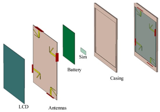 Figure 2, displays the dimensions of a single dipole antenna element, where the values of and are ≈0.48 , and is ≈/4, for each antenna element. The values of , , and are adjusted using detailed parametric analysis, performed in Computer Simulation Technology (CST) Studio Suite® 2018. The values of these design parameters are further listed in Table 2. The Figure 3, depicts the hierarchical cross-section view of the housing box being used to test the stability of the proposed antenna design for the real environment. The housing box is made up of a battery, LCD, casing, and a subscriber identity module (SIM). The housing box battery is composed of nickel, having a thermal conductivity of 91 W/K/m, and electrical conductivity of S/m. Whereas the LCD of the housing box is composed of lead glass, with electrical conductivity of S/m, the casing is composed of polycarbonate thermal conductivity of 0.19 W/K/m. The material used for the SIM is silicon, with a thermal conductivity of 198 W/K/m.