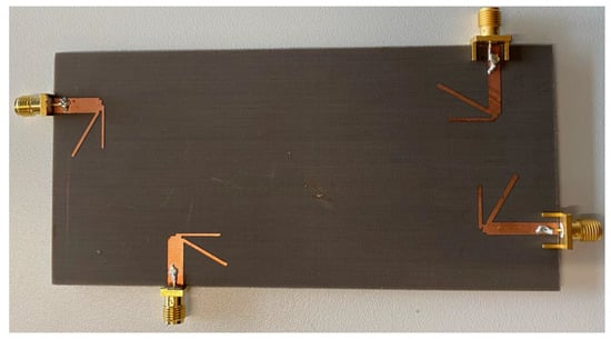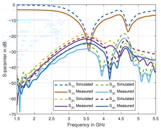 The prototype of our novel four-element dipole 4 × 4 MIMO antenna design is fabricated and is shown in Figure 4. The performance of the proposed antenna design is confirmed by comparing the simulated results with the measured results. Figure 5 shows a comparison of simulated and measured S-parameters of the proposed dipole antennas. Since our design is symmetrical, we have shown the results of a single antenna element only, i.e., Antenna 1 as labelled in Figure 1A. The measured and simulated for Antenna 1 (because of symmetry other elements would have similar results), is well below −10 dB and isolation between elements, i.e., for instance, , , and , are below −15 dB. Since each antenna element’s isolation is below −15 dB, the proposed antenna can be considered an excellent candidate to satisfy the MIMO criteria.