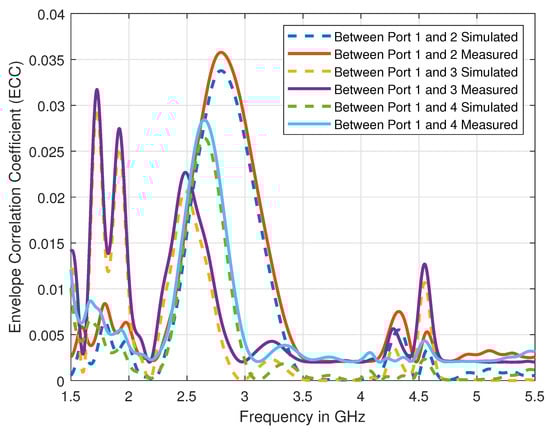 Using the measured S-parameters data as shown in Figure 5, the value of loss in capacity is calculated to be ≈0.19 bps at 3.6 GHz and ≈0.18 at 4.7 GHz, which is lower than the required threshold. Indeed, ECC’s calculated values and the loss in capacity show that our proposed antenna design can ensure an acceptable MIMO performance.