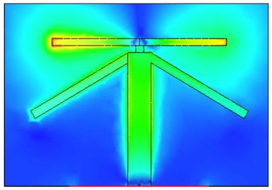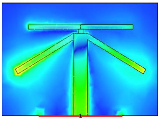 Figure 7, Figure 8 and Figure 9 shows the dual-band working of the proposed design by using the simulated current distribution results obtained from CST. Figure 7, proves that the lower arm only resonates at 3.6 GHz. Whereas in Figure 8, it can be seen that the upper arm only plays a role in achieving the higher resonance frequency, i.e., 4.7 GHz. The location of the two adjacent elements is optimized. Whenever element 1 has its maximum resonance current, element two will have a minimum amplitude of the current, and it can be seen in Figure 9. This arrangement makes the relative currents of the elements orthogonal and results in a low corresponding ECC value (see Figure 6 for ECC results).