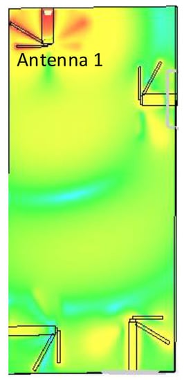 In Figure 12, we have shown the effect of the human handgrip on the proposed antenna design’s total antenna efficiency. The total antenna efficiency of each element in free space is −2.88 dB (Antenna 1), −3.12 dB (Antenna 2), −1.92 dB (Antenna 3) and −2.45 dB (Antenna 4) at 3.6 GHz, while at 4.7 GHz are −1.61 dB (Antenna 1), −2.19 dB (Antenna 2), −1.72 dB (Antenna 3) and −1.18 dB (Antenna 4), respectively. Moreover, as shown in Figure 12, the effect of the housing box and human handgrip reduces the total antenna efficiency by 5%, as compared to the values calculated in the free space. The small variation in antenna efficiency occurs due to the carefully designed configuration where the elements are placed strategically to minimize the overlap (see Figure 9).