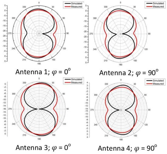 Figure 10, shows the comparison of measured and simulated radiation patterns. Due to presence of symmetry, we have shown the simulated and measured radiation pattern at 3.6 GHz, in E-plane, i.e., for Antenna 1 and 3, the E-plane is at , and for Antenna 2 and 4, the E-plane is at . It is evident from these results that the proposed antenna is working well, as the measured and simulated radiation patterns are in agreement and exhibit the patterns similar to a dipole.
