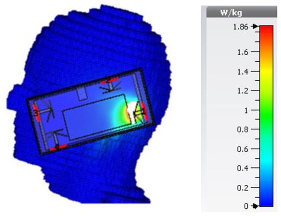 In Figure 11, we have performed the SAR analysis, while incorporating the housing box (for the composition of the housing box, see Figure 3). The SAR values averaged over 10 g of body mass is measured to be 1.8 W/kg at 3.6 GHz and 1.7 W/kg at 4.7 GHz (the maximum input power used for SAR calculation is 0.2 Watts, which in line with the requirements set for the transmission of data in LTE) that is well below the guidelines specified by International Commission on Non-ionizing Radiation Protection (ICNIRP) (i.e., 2.0 W/kg for 10 g) [29]. The small variation in two SAR values can be related to near-field size, which decreases with an increase in frequency.