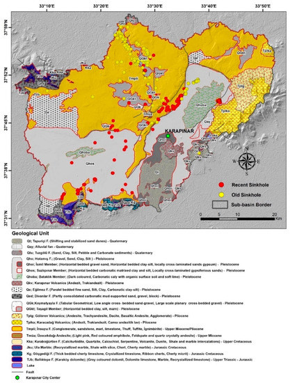 - Törk, K.; Erduran, B.; Yılmaz, P.; Sülükçü, S.; Güner, İ.N.; Ateş, Ş.; Mutlu, G.; Keleş, S.; Çınar, A.; Demirbaş, Ş.; et al. Determination of Karst Depression Areas and Hazard Assessment in Konya Basin; Mineral Research and Exploration Institute: Ankara, Turkey, 2013; p. 320. (In Turkish) [Google Scholar]