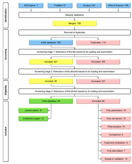 The wide spectrum of wearable categories, potentials, and applications has inspired the conduction of several researches and many reviews of their use in various fields []. For instance, Seneviratne et al. [] survey the trends, technologies, research challenges, and solutions for commercially available wearable devices and research prototypes. Khakurel et al. [] systematically review the trend of wearable technology to assess both its potential in the work environment and the challenges concerning its utilisation in the workplace. Mardonova and Choi [] review trends in wearable device technology, providing an overview of its prevalent and potential applications to the mining industry. Also recent studies give insights of the state of the art of wearable equipment: e.g., Chander et al. [] focus on wearable stretch/strain sensors technology for human movement monitoring and fall detection, Koutromanos and Kazakou [] on the use of smart wearables in primary and secondary education, and their impact on learning and teaching, and Niknejad et al. [] on recent advances and future challenges of smart wearables. Also in the ergonomic field some reviews have been published, but considering only a limited scope of the wearable device use: Tsao et al. [] summarise the applications of wearable sensors for human work and status evaluation, whereas Lim and D’Souza [] synthesise the literature on body-worn inertial sensing for assessing biomechanical exposures and musculoskeletal disorder risk resulting from physical work.