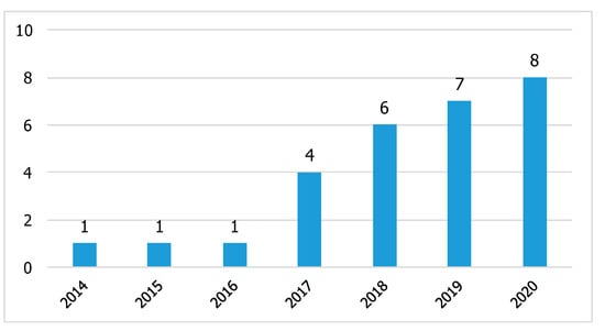 Although in the search strategy a starting date was not defined, the first relevant paper was published only in 2014 by Peppoloni et al. []. The distribution over time of the results, displayed in Figure 2, shows that more than half of the papers were published in 2019 and 2020. Furthermore, even though the review was stopped on 31 August, the majority of articles were published in 2020. This trend confirms a recent and growing interest in this area of research.