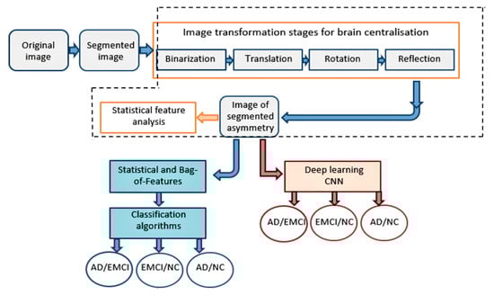 A limitation of this study is that it did not investigate handedness and its influence on the classification results, as the images downloaded from the ADNI database were not separated according to the handedness. Thus, a potential direction for further work concerns an investigation of the role and the impact of asymmetric differences between the right- and left-handed patients. In addition, the potential of deep learning models deserves further study. Lastly, a longitudinal study inside the group of patients with mild cognitive impairment could help to distinguish between stable and progressive dementia and monitor further changes in the brain due to the development of the disease. This asymmetrical changes in the brain can be tested with other psychiatric conditions such as schizophrenia and Parkinson’s Disease.
