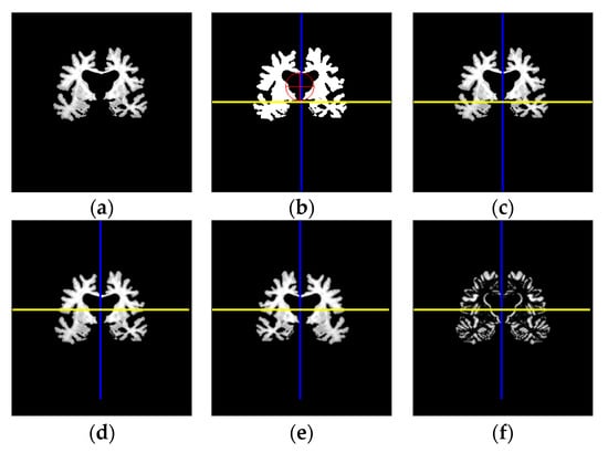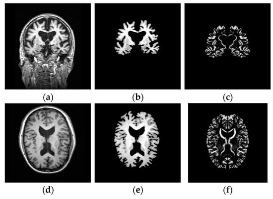 T1-waited brain MRI processing in 2 axes of symmetries: (a) Original image in the coronal plane; (b) Segmented image of the brain tissues in the coronal plane; (c) Image asymmetry in the coronal plane; (d) Original image in the axial plane; (e) Segmented image of the brain tissues in the axial plane; (f) Image asymmetry in the axial plane.