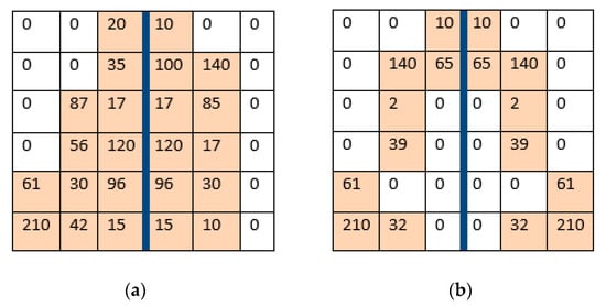 Matrices of gray-scale image: (a) Initial matrix; (b) Matrix of segmented asymmetry mirrored via the vertical axis.