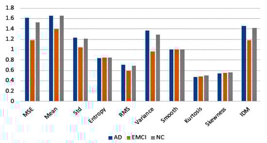 Statistical mean of each image asymmetry feature for normal cognition (NC), early minor cognitive impairment (EMCI), and Alzheimer’s disease (AD) patients.