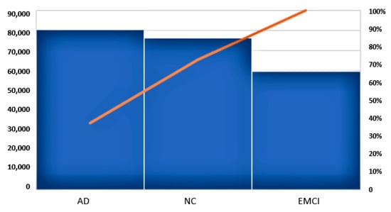 Figure 6 provides an MSE feature analysis with a Pareto chart. The MSE value for each class has been calculated from the differences between the original image and its mirrored version for all images in that class and indicates the impact of asymmetry for each class. The highest MSE bar for AD confirms that changes in symmetry in the MRI slices of this image group are substantial compared to changes in symmetry in the MRI slices of the other groups, with the EMCI group’s images looking more “symmetrical” than the others. The cumulative line on the secondary axis shows the contribution of each bar (image class) in the total value as a percentage.