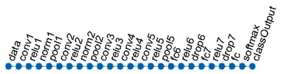 The potential of transfer learning was also explored by applying a type of Convolutional Neural Network (CNN), the so-called AlexNet [61,62]. This is a convolutional neural network with 8 deep layers. The network has five convolutional layers and three fully connected layers. The 1-st layer requires input image of size 227-by-227-by-3, where 3 is the number of color channels.