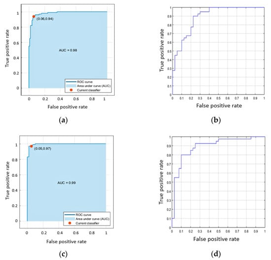 Figure 8 presents the AUC/ROC curves of three binary datasets for the C-SVM and CNN classifiers. All the sub-figures were created on Matlab during data testing.