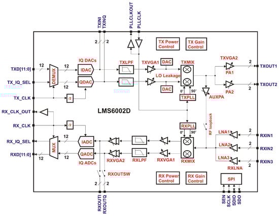 - Lime Micro Systems. LMS6002D Data Sheet. Available online: https://limemicro.com/app/uploads/2015/10/LMS6002Dr2-DataSheet-1.2r0.pdf (accessed on 23 January 2021).