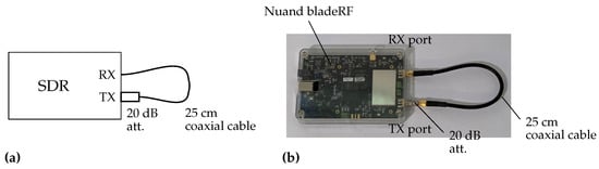 Software-defined radio (SDR) is a tool that is primarily intended to be used to test and prototype various communication applications such as wireless communications and the Global Navigation Satellite System (GNSS). For example, these include mobile telecommunication [,], multi-static multiple-input and multiple-output (MIMO) communication [,,], Wi-Fi [], characterizing radio-frequency identification (RFID) tags [,], prototyping a global positioning systems (GPS) receiver [,], locating satellites [], and indoor positioning []. The use of SDR is becoming popular because of the fully digital in-phase and quadrature (I/Q) interface, which provides flexibility in signal generation and postprocessing of received signals. An SDR typically employs a direct conversion (homodyne, zero-IF) transmitter and receiver architecture to make it simple, compact, and inexpensive compared to general-purpose RF instruments such as the VNA and the spectrum analyzer. For example, the price of low-cost SDRs can be one-hundredth that of mid-grade VNAs. Therefore, it is suitable for prototyping.