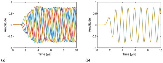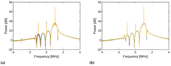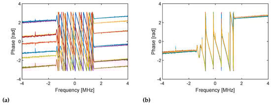 The in-phase component of the received RX baseband samples for 10 repetitions is shown in Figure 4. All the baseband signals consistently start being received at approximately 1.5 μs in both cases. This indicates that the TX and RX streaming are synchronized. This yields the identical power spectra shown in Figure 5. However, the phase of the received signals varies when frequency tuning is performed every time (Figure 4a), and the signals thus exhibit randomly varying phase spectra (Figure 6a). This may be caused by the slightly different timings of the frequency lock of the TX and RX PLLs, which changes the relative phase between the TX and RX LO signals. By contrast, when frequency tuning is performed only once at the beginning (Figure 4b), a consistent phase is obtained, which yields the identical phase spectra shown in Figure 6b. The phase of the TX and RX LO signals where the signals start being mixed (i.e., and in Figure 2) must be different for the 10 repetitions of streaming. However, because frequency tuning is not performed during the repetition, the relative phase between the TX and RX LO signals is kept unchanged. Therefore, the unknown phase term in Equation (9) is also kept unchanged, and all the RX baseband signals have the same phase. The result verifies the discussion in the previous section and implies that phase compensation using a loopback signal works as long as the two streaming for the DUT and internal RF loopback paths are performed immediately in quick succession without frequency tuning.