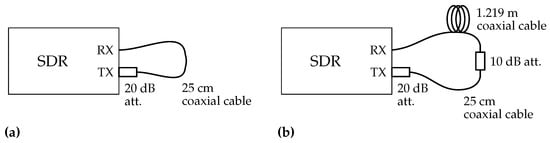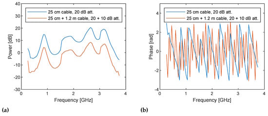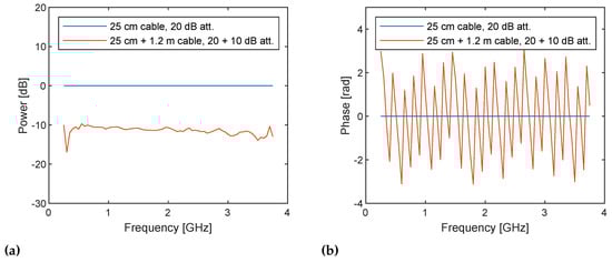 The TX baseband signal fixed at 1 MHz is again generated in the host computer and transferred to the SDR. The TX and RX LO frequencies are swept so that the frequencies of the signals transmitted from the TX port (i.e., the sum of the baseband and LO frequencies) range from 250 MHz to 3.75 GHz, which is almost the full bandwidth of the LO frequency of the SDR, with a step size of 50 MHz. At each LO frequency, two streaming for the DUT and loopback paths are performed immediately in quick succession without frequency tuning, as discussed in the previous section. The TX and RX sampling frequencies and the number of baseband samples are respectively set to 32 MHz and 4096. In this experiment, the DUT is a 25 cm coaxial cable and 20 dB attenuator that configure cable through between the TX and RX ports as shown in Figure 7a and as in the test described in the previous section. Moreover, another measurement is performed with an additional 1.219 m (4 ft) cable and 10 dB attenuator extending the cable through set-up as shown in Figure 7b. The set-up of the experiment is summarized in Table 2.
