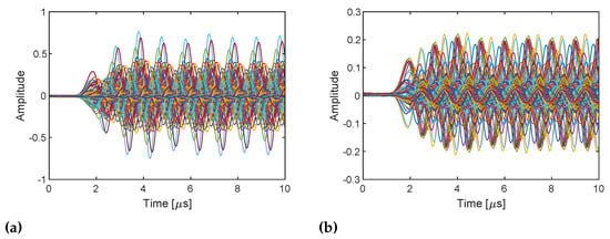 In-phase components of the RX baseband signals for 71 TX and RX LO frequencies in (a) the DUT channel (cable through with 25 cm cable and 20 dB attenuator) and (b) the reference channel (internal RF loopback). All baseband signals start being received at approximately 1.5 μs which indicates that the TX and RX streaming are synchronized.